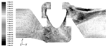 圖6 閥軸對稱面的速度矢量圖